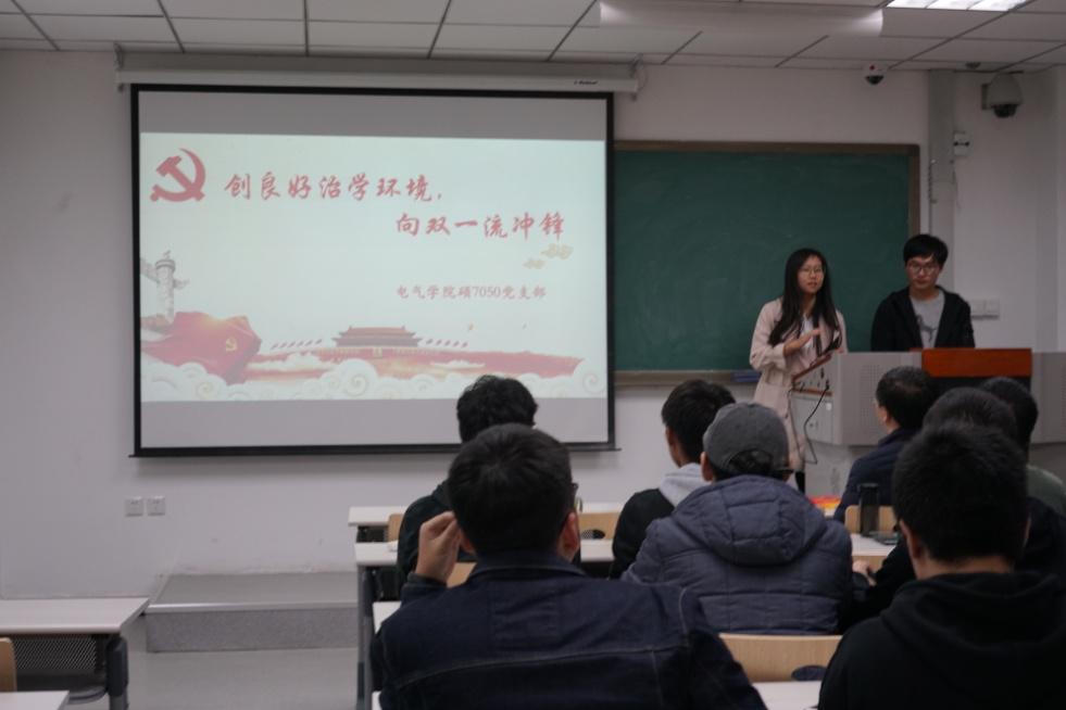 硕7050班党支部学生王哲作开场发言。他从“双一流”内涵、建设目标、及“双一流”与西安交大等几个方面做了简单介绍:西安交通大学入选“双一流”A类建设高校,电气工程、能源与动力工程、力学、机械工程等8个学科入选一流建设学科。这一消息振奋人心,为我校在新时代下实现内涵式发展提供了新的历史机遇。