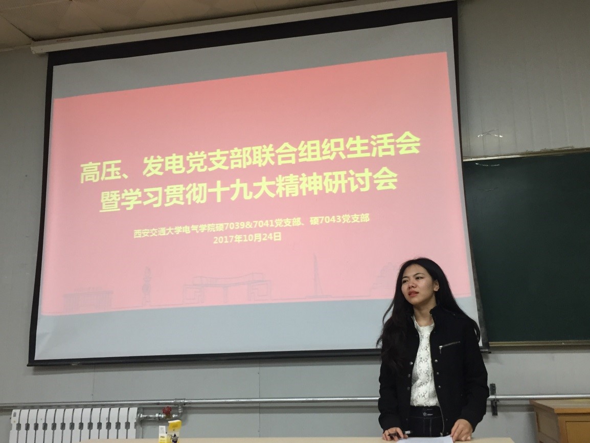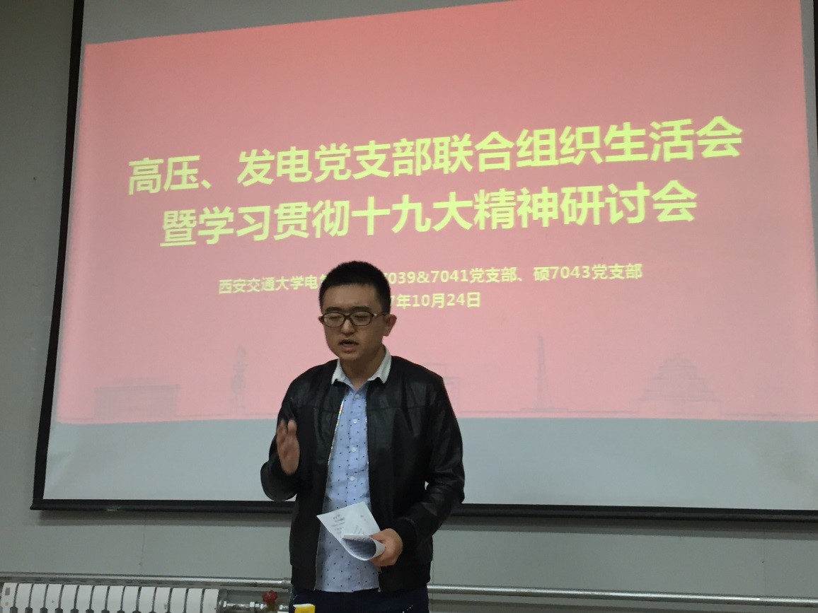 2017年10月24日晚,硕7039/41班党支部和7043班党支部在高电压技术教研室联合举行了主题为“学习贯彻十九大精神”的组织生活会。