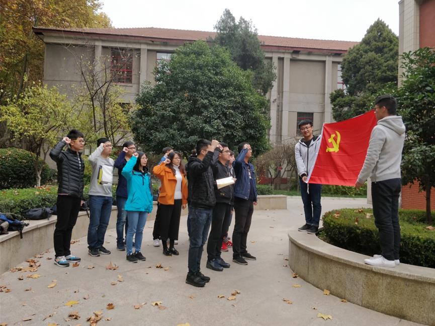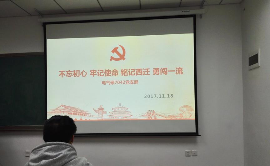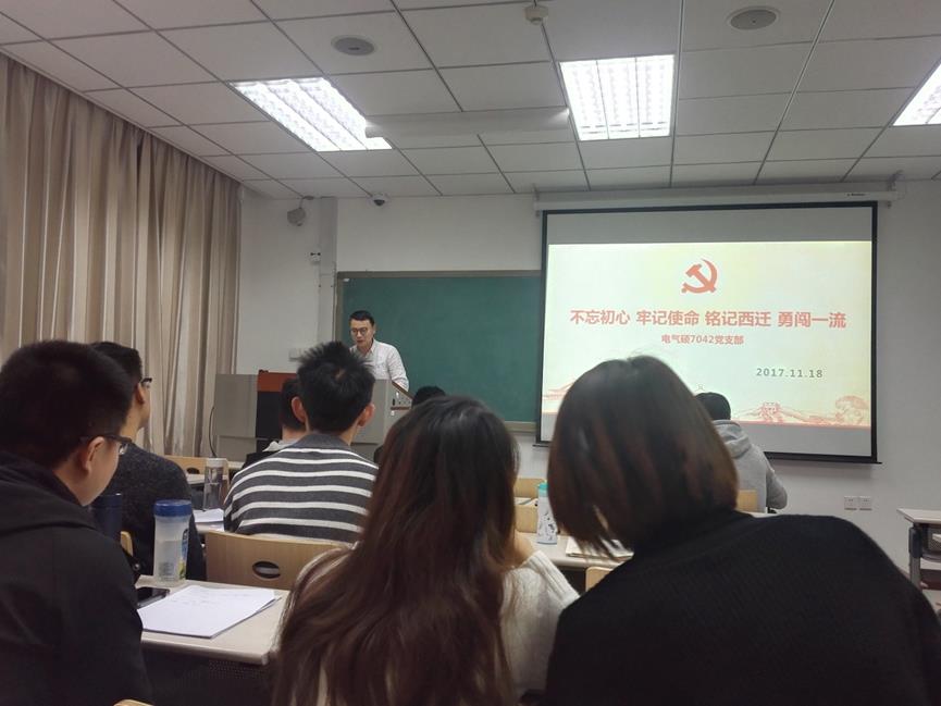 初冬的早上,风送下树叶,交大校园满是金黄铺就的道路,这座古老的大学在百廿校庆,双甲子新征程上迎来了双一流建设的伟大目标。11月18日早上,正值党的十九大在北京胜利闭幕一个月之际,电气硕7042党支部在中心二楼-2210举办了主题为“不忘初心,牢记使命,铭记西迁,勇创一流”的组织生活会,会后全体党员在西迁精神墙处进行庄严宣誓。组织生活会由支部书记高鑫主持,全体党员参加。