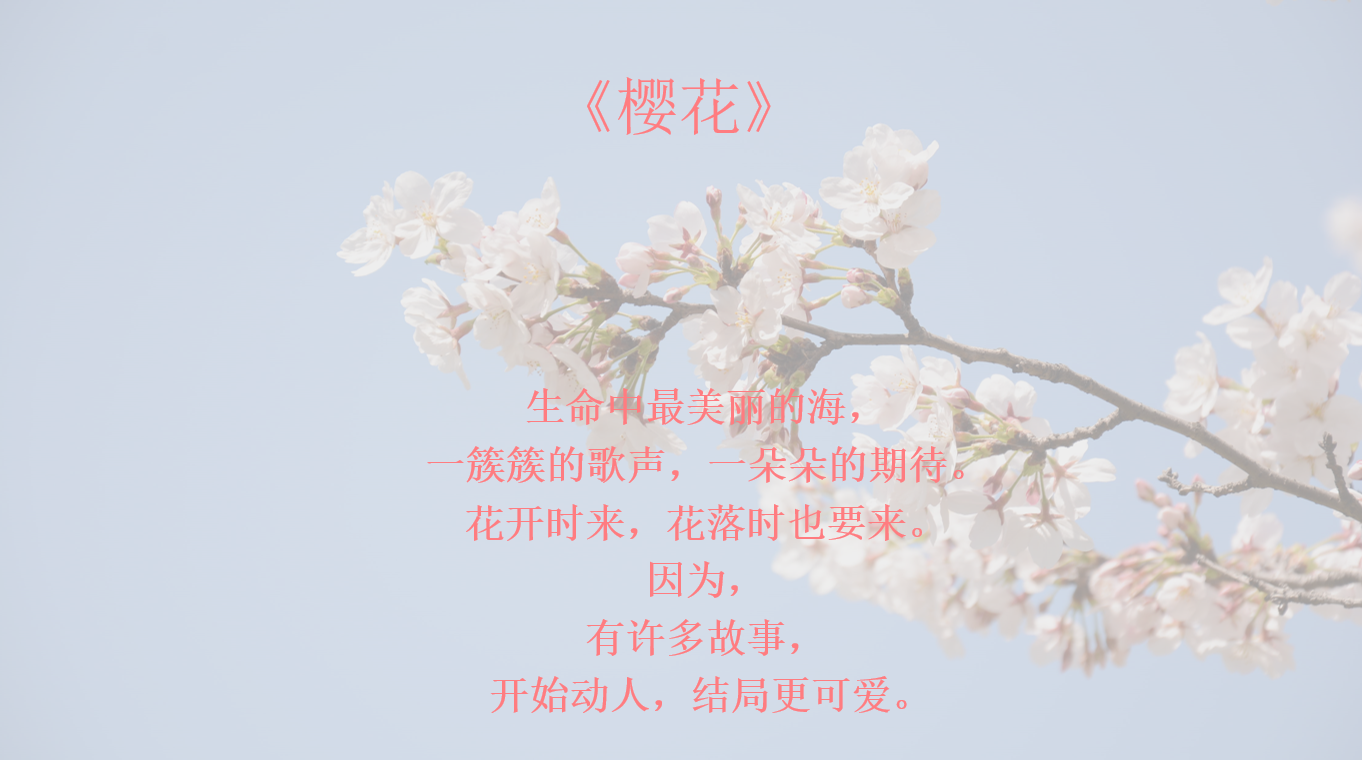 樱花是一种团结的花,它们往往一树一树的开,形成美丽的花海。这首歌传达出樱花美而易逝的生命意象,一朵樱花从盛开至凋零不过短短七日,但它们开的绚烂,凋谢迅急,意味着要活出精彩,也要死的壮美,人生一世不可碌碌无为。希望同学们趁着年轻多做一些有意义的事,不负韶华享受生活实现理想。