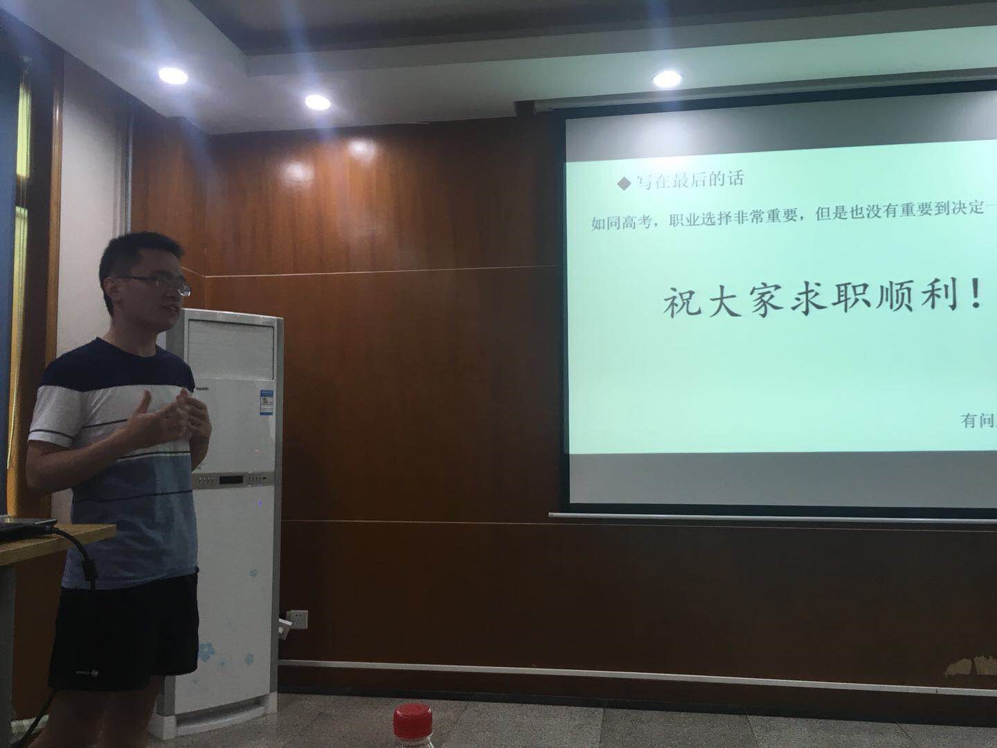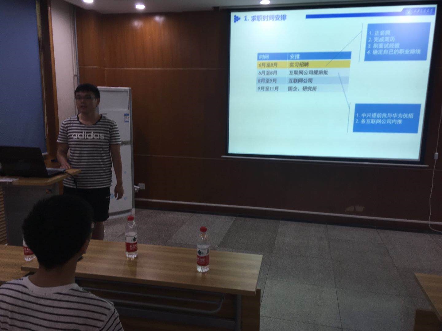 陈毅师兄签约的是深圳华为公司,他向我们详细地介绍了简历制作技巧和面试经验。简历制作需要做到实事求是,重点突出,要把制作简历的过程当成一次接受面试的过程,决不可掉以轻心。涉及到面试,以华为公司为例,主要分为群面、技术面和综合面。群面要根据自己的性格特点或岗位需求决定自己的角色,充分发挥自己角色应该发挥的作用。在群面发言过程中讲话一定要要思维缜密、逻辑性强,同时尽量多为团队争取利益,盲目地表达自己的个人观点并不可取。技术面主要检测面试者的逻辑思维能力、学习能力和项目经验,对此师兄再次强调表达的逻辑性一定要高,思维一定要缜密。最后是综合面,综合面的考官往往是企业的中上层领导,面试的形式常常是聊家常,这种形式很容易让人疏忽懈怠,但是面试官恰恰会从聊天中判断我们的性格特点,因此千万要谨慎。