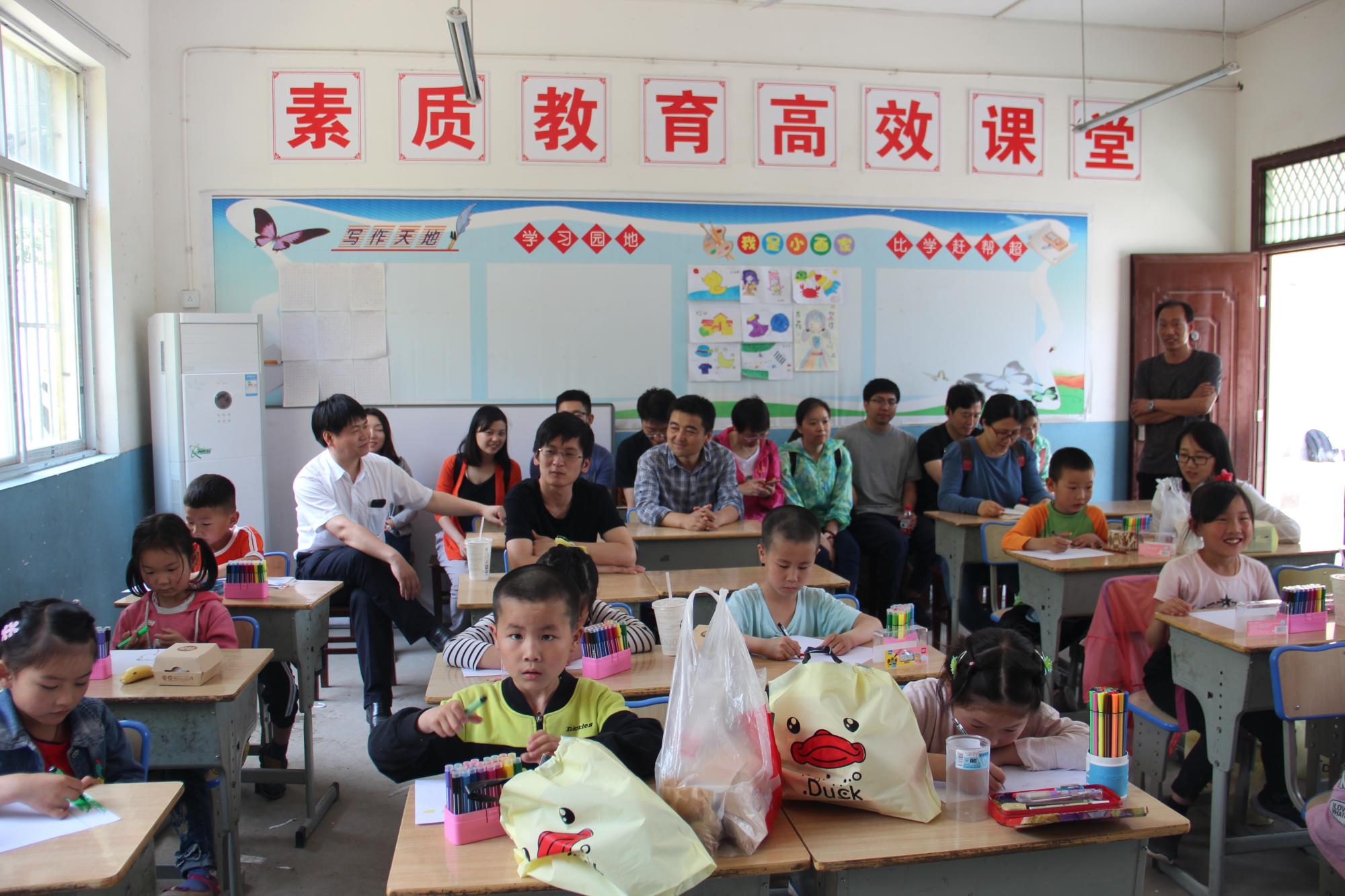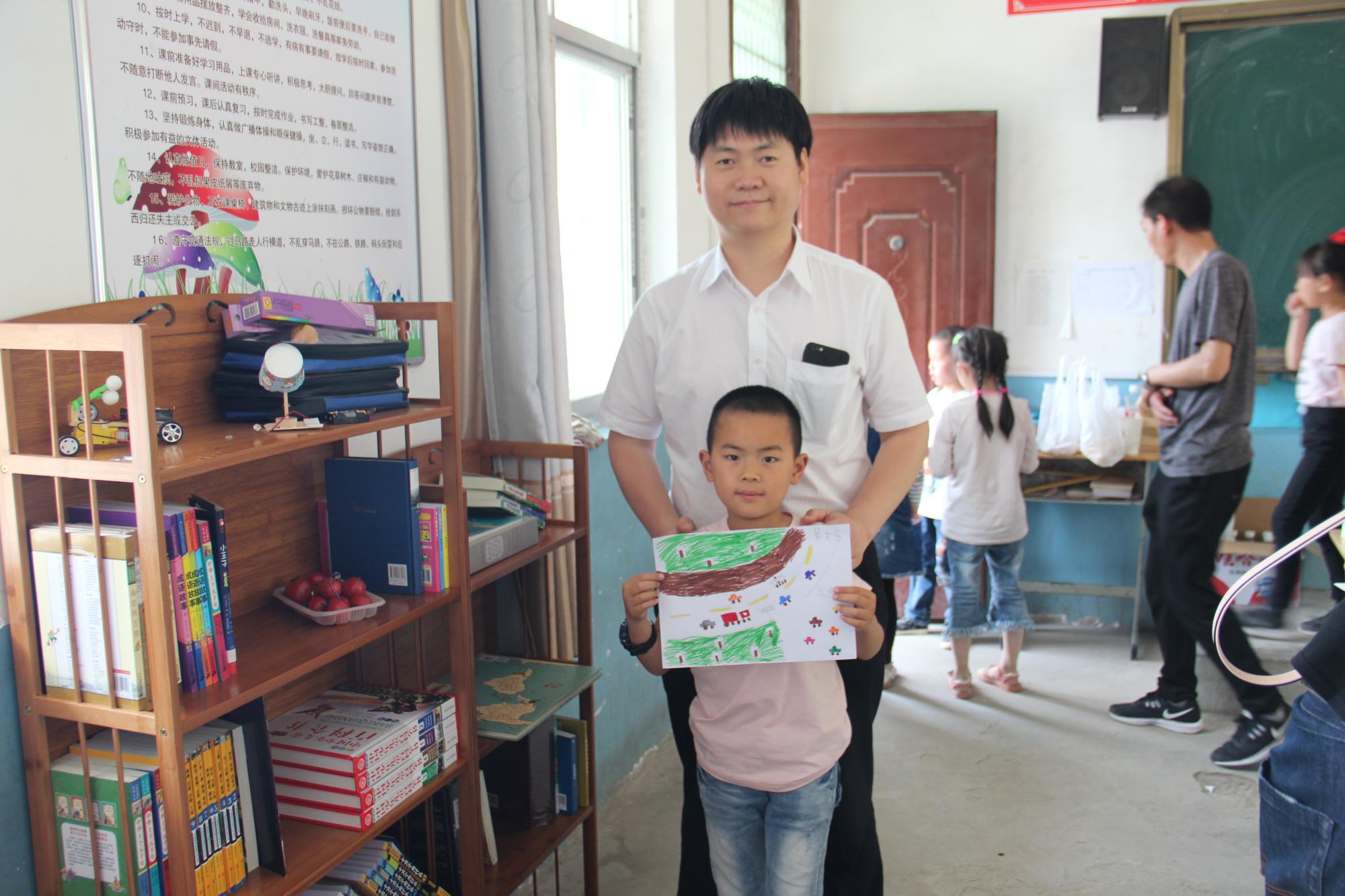 为了感谢交大电气学院对于山村教育工作的支持,枣园小学马老师现场给孩子和电测党支部师生们上了一堂生动有趣的美术课。课上,每一位孩子都化身小画家,在洁白的图纸上画下他们心中的彩色世界,并将图画全都赠与党支部师生留作纪念。